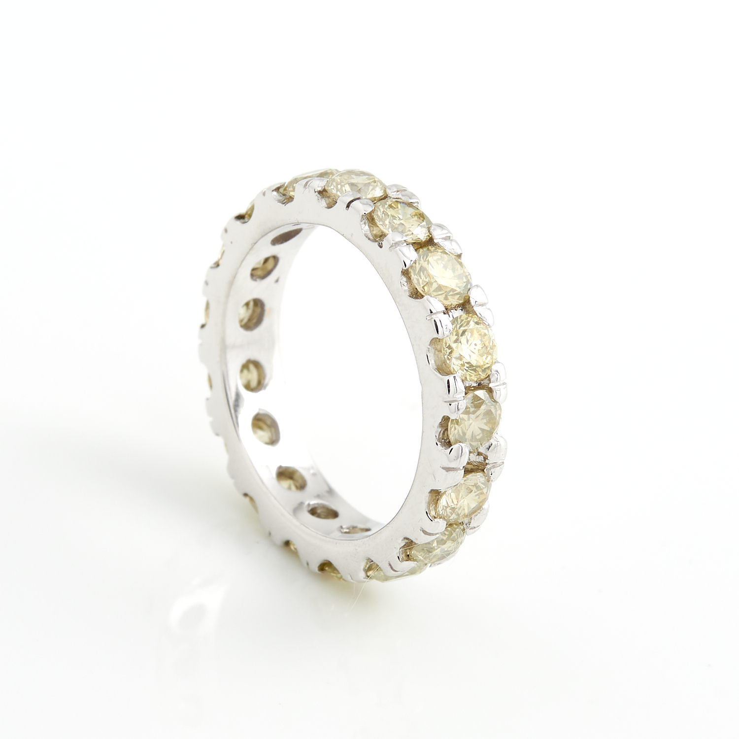 A YELLOW DIAMOND ETERNITY RING IN 18CT WHITE GOLD, THE DIAMONDS TOTALLING 3.35CTS, VS/SI FANCY YELLOW, SIZE M 1/2