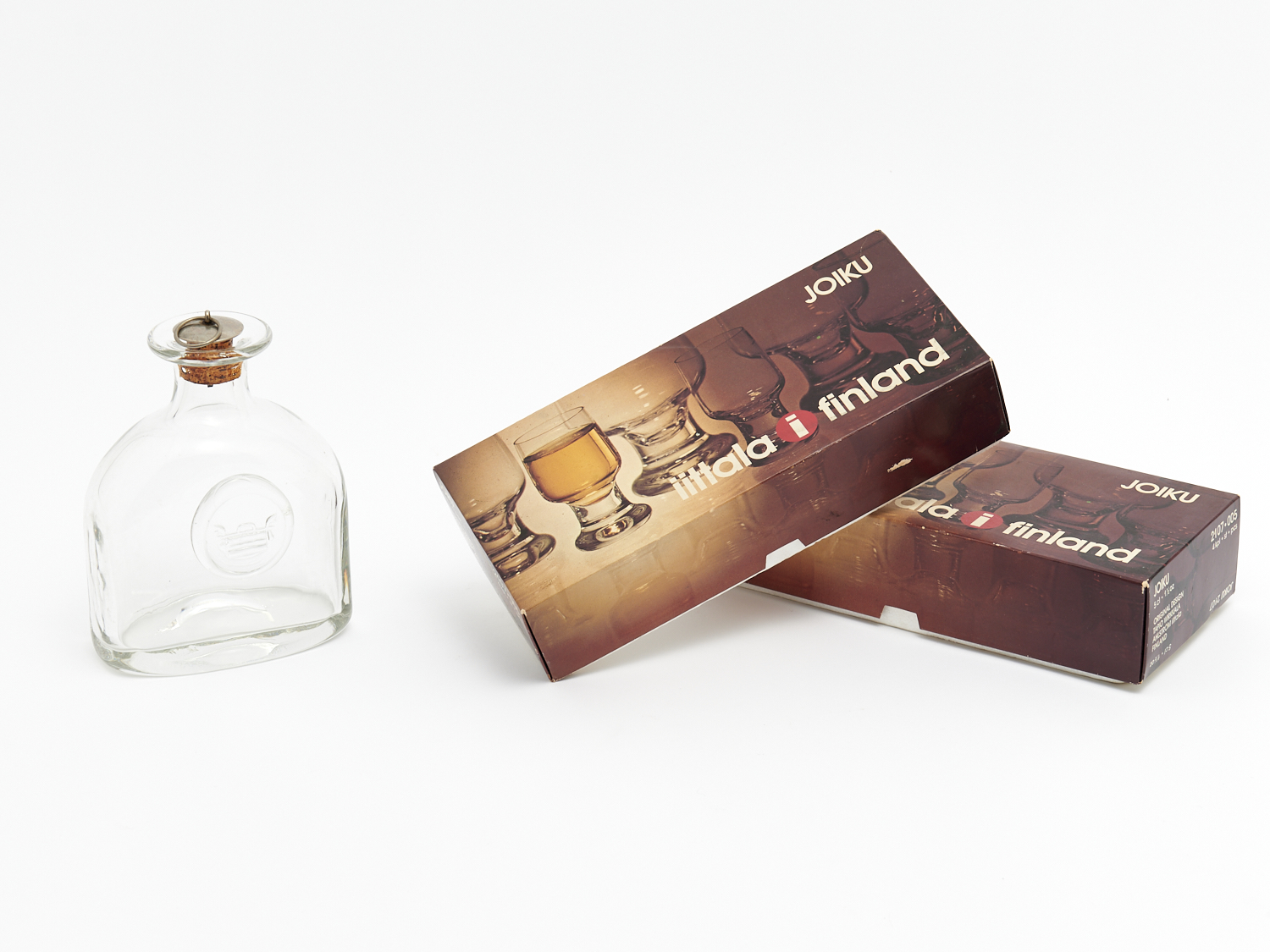 A SCANDINAVIAN SCHNAPPS DECANTER AND EIGHT IITTALA SHOT GLASSES IN ORIGINAL BOXES BY TAPIO WIRKKALA H.17CM (DECANTER), LEONARD JOEL DELIVERY SIZE: MEDIUM