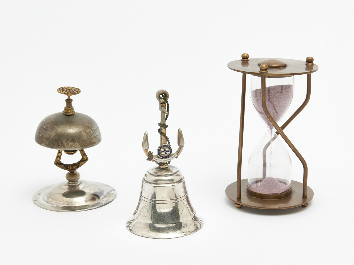 A SILVERPLATED SHIPPING LINE BELL, A COUNTER BELL AND A BRASS HOURGLASS H.16.5CM (TALLEST), LEONARD JOEL DELIVERY SIZE: MEDIUM