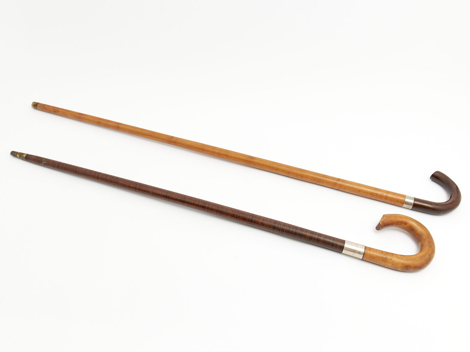 TWO 1900S AUSTRALIAN SILKY OAK AND FIDDLEBACK BLACKWOOD WALKING STICKS WITH SILVER MOUNTS L.94CM (LONGEST), LEONARD JOEL DELIVERY SIZE: LARGE