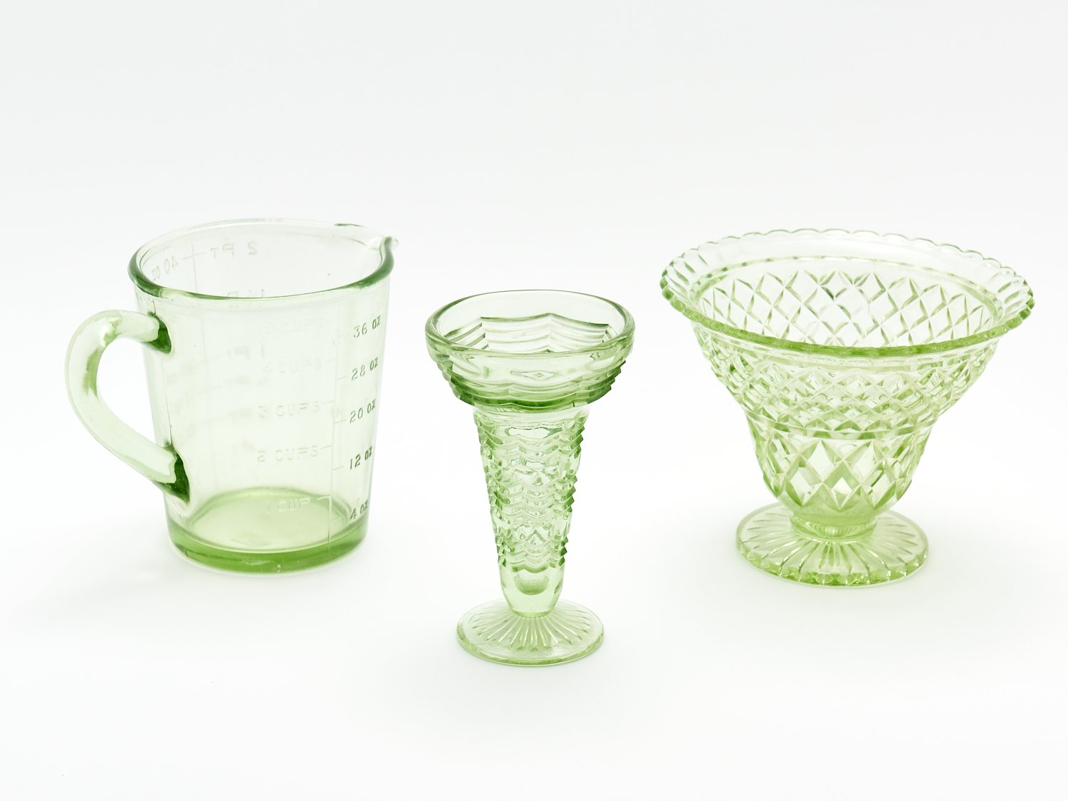 A COLLECTION OF THREE DEPRESSION GREEN GLASS ITEMS INCLUDING JUG VASE AND TWO VASES H16.5CM (TALLEST), LEONARD JOEL DELIVERY SIZE: LARGE