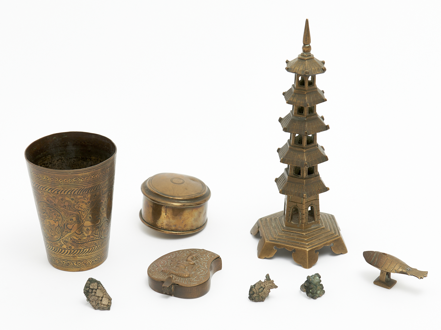 A COLLECTION OF EIGHT PIECES OF ANTIQUE ISLAMIC AND CHINESE BRASS ITEMS INCLUDING THREE EARLY RINGS H.22.5CM (TALLEST), LEONARD JOEL DELIVERY SIZE: SMALL