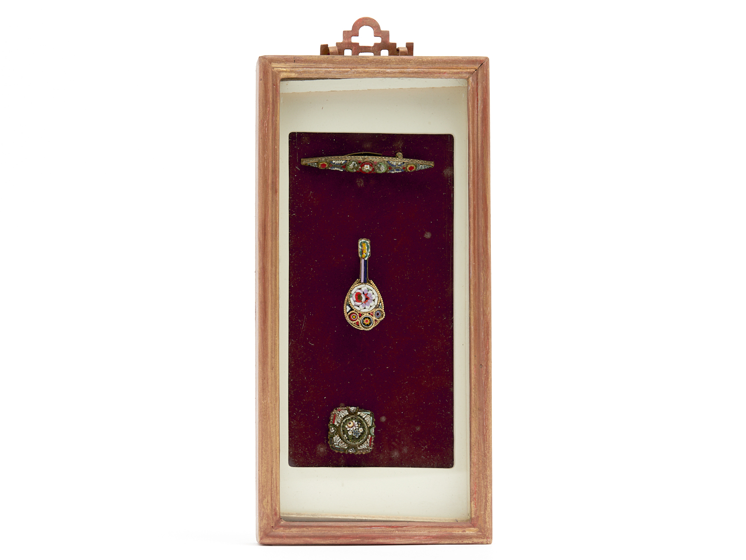 A FRAMED COLLECTION OF THREE ITALIAN MICRO MOSAIC BROOCHES 23 X 11CM, LEONARD JOEL DELIVERY SIZE: SMALL