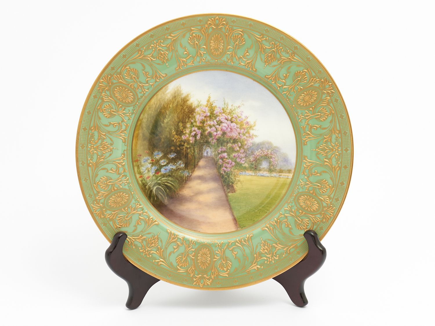 A HANDPAINTED ROYAL WORCESTER DISPLAY PLATE, 'THE PERGOLA BRANTWOOD' SIGNED RUSHTON (A/F) DIA.27.5CM, LEONARD JOEL DELIVERY SIZE: MEDIUM