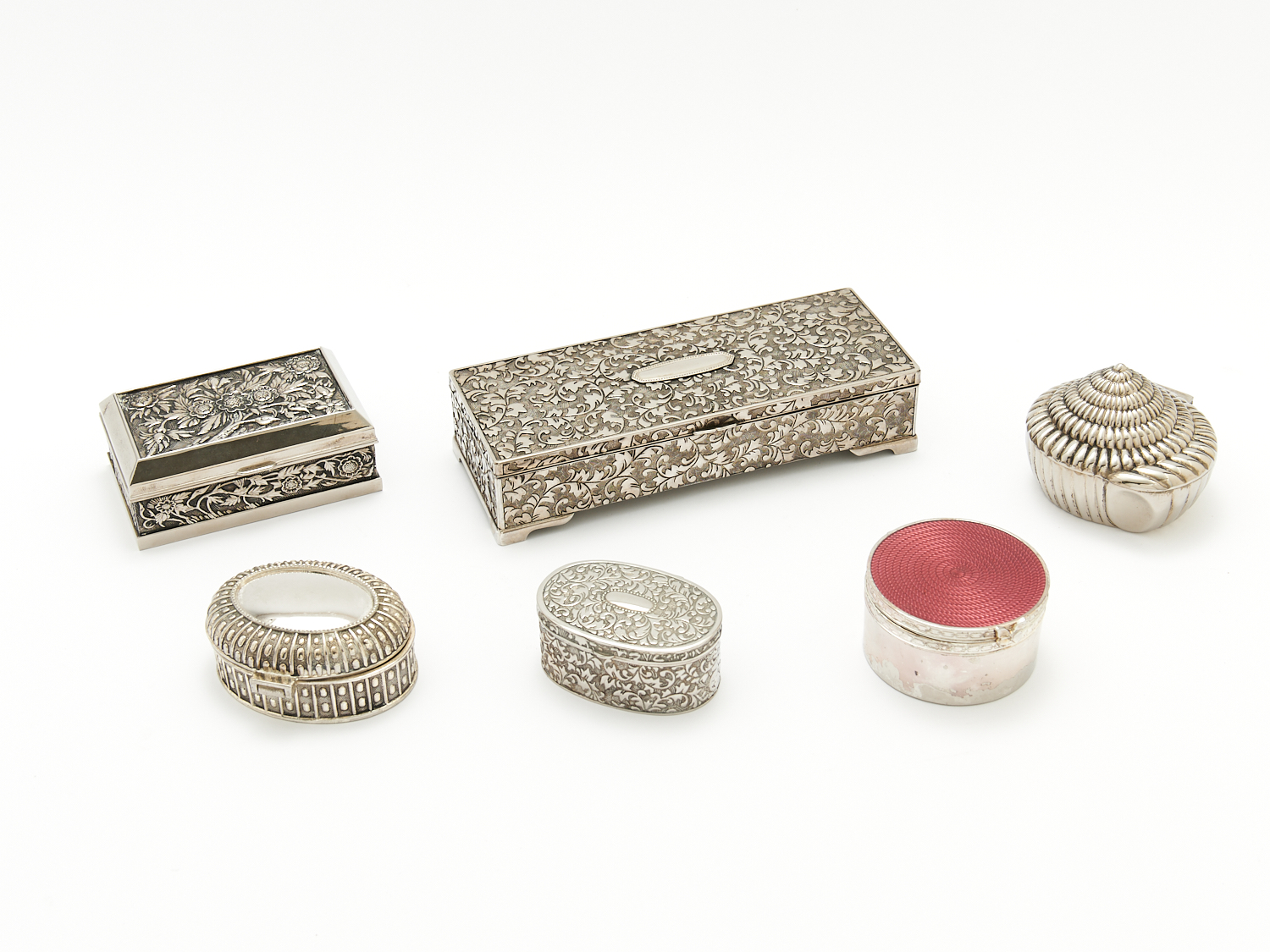 A COLLECTION OF SIX VINTAGE SILVER PLATE ENGRAVED AND FLORAL DECORATED JEWELRY BOXES WITH HINGED LIDS L.23CM (LARGEST), LEONARD JOEL DELIVERY SIZE: LARGE