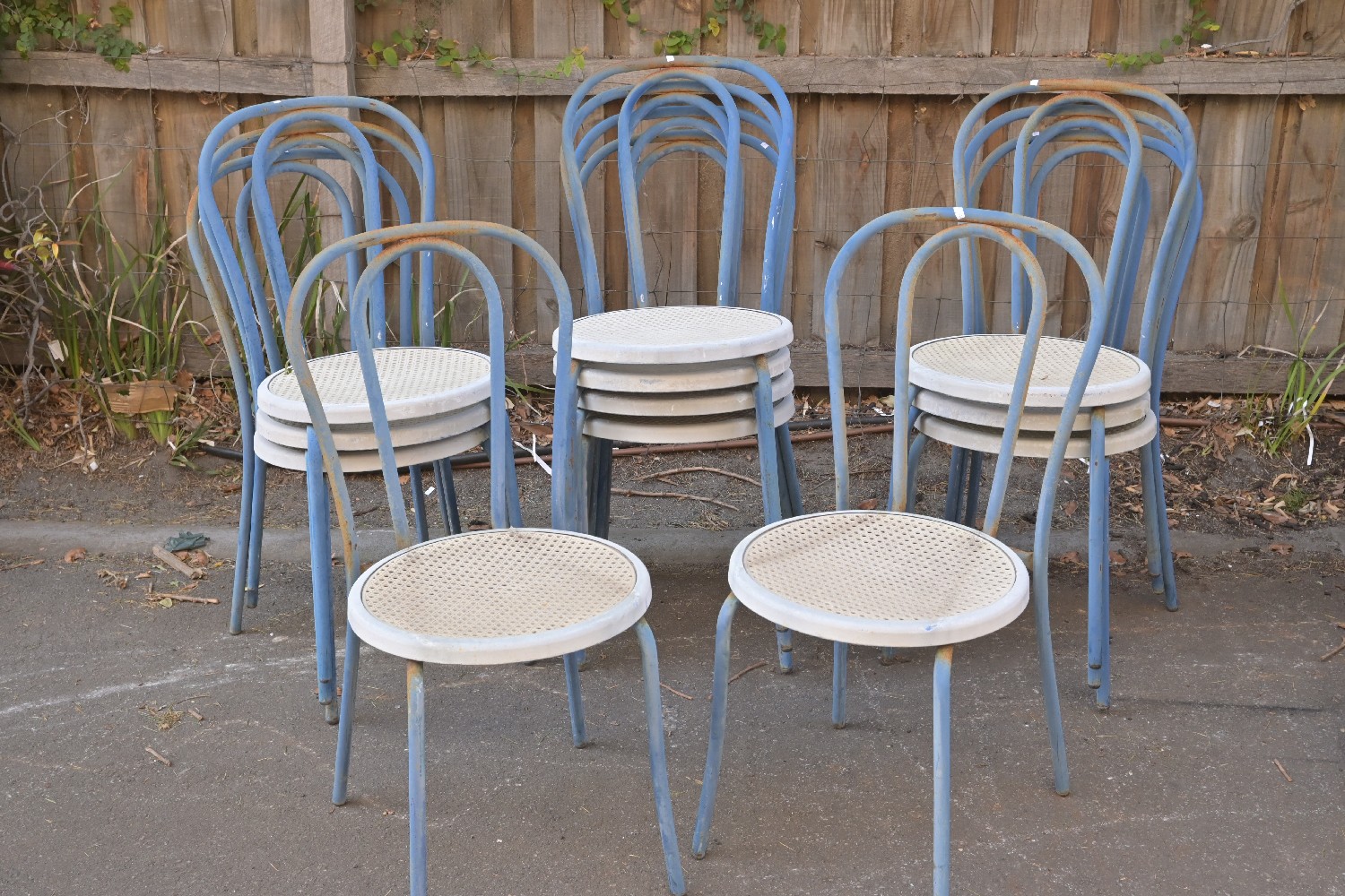 A SET OF TWELVE FRENCH METAL BLUE OUTDOOR DINING CHAIRS (A/F) (87H X 41W X 57D CM) (PLEASE NOTE THIS HEAVY ITEM MUST BE REMOVED BY CARRIERS AT THE CUSTOMER'S EXPENSE. LEONARD JOEL STAFF CANNOT ASSIST CARRYING THIS ITEM) (LARGE ITEM)