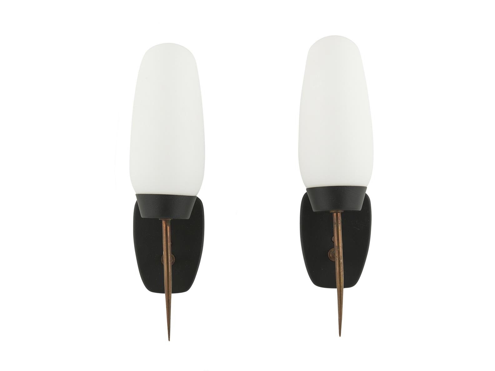 Minor marks and surface scratches throughout consistent with age and previous use. Signs of aging and patina development to brass. Minor nibbles to edge of glass shades. Untested. Recently re-powdercoated. No major losses.