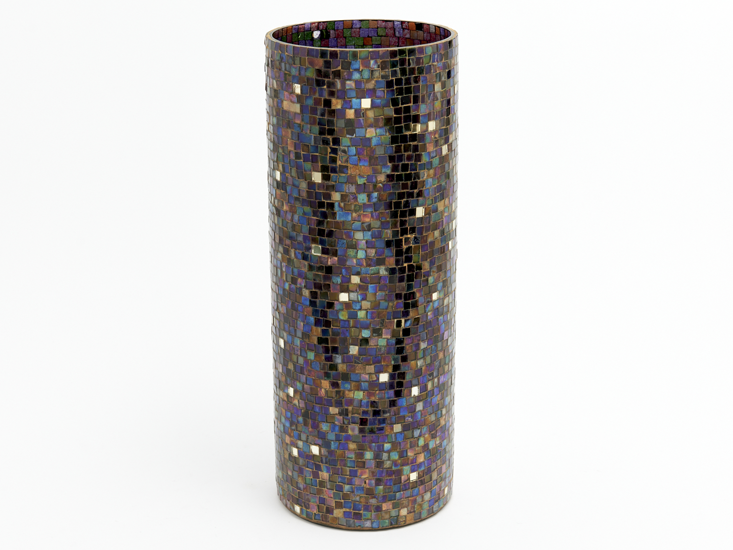 A MOSAIC IRRIDESCENT CYLINDRICAL GLASS VASE H.39CM, LEONARD JOEL DELIVERY SIZE: MEDIUM