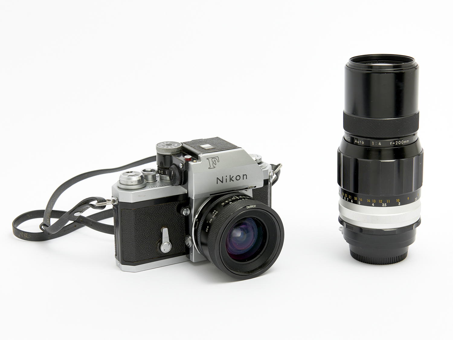 A NIKON F CAMERA WITH PHOTOMIC HEAD, 1967 WITH A 24MM F2.5 TAMRON LENS AND A 200MM F4 NIKKOR-Q LENS, WITH UV FILTER AND LENS CAPS, LEONARD JOEL DELIVERY SIZE: SMALL