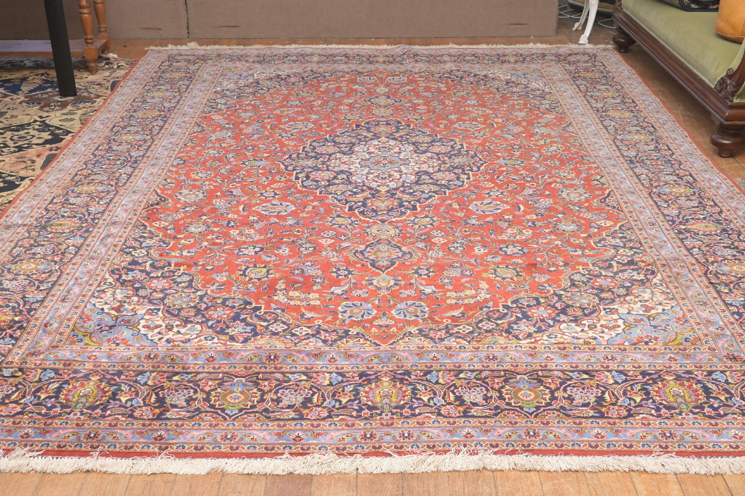 A HAND-KNOTTED PERSIAN KASHAN CARPET, 100% LAMBS WOOL. DENSE PILE. CLASSIC KASHAN DESIGN OF OVAL ELONGATED MEDALLION & CORNER MEDALLION (400 X 300 CM) (PLEASE NOTE THIS HEAVY ITEM MUST BE REMOVED BY CARRIERS AT THE CUSTOMER'S EXPENSE. LEONARD JOEL STAFF CANNOT ASSIST CARRYING THIS ITEM) (X-LARGE)