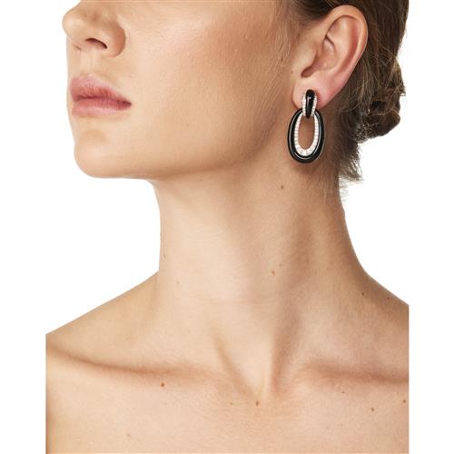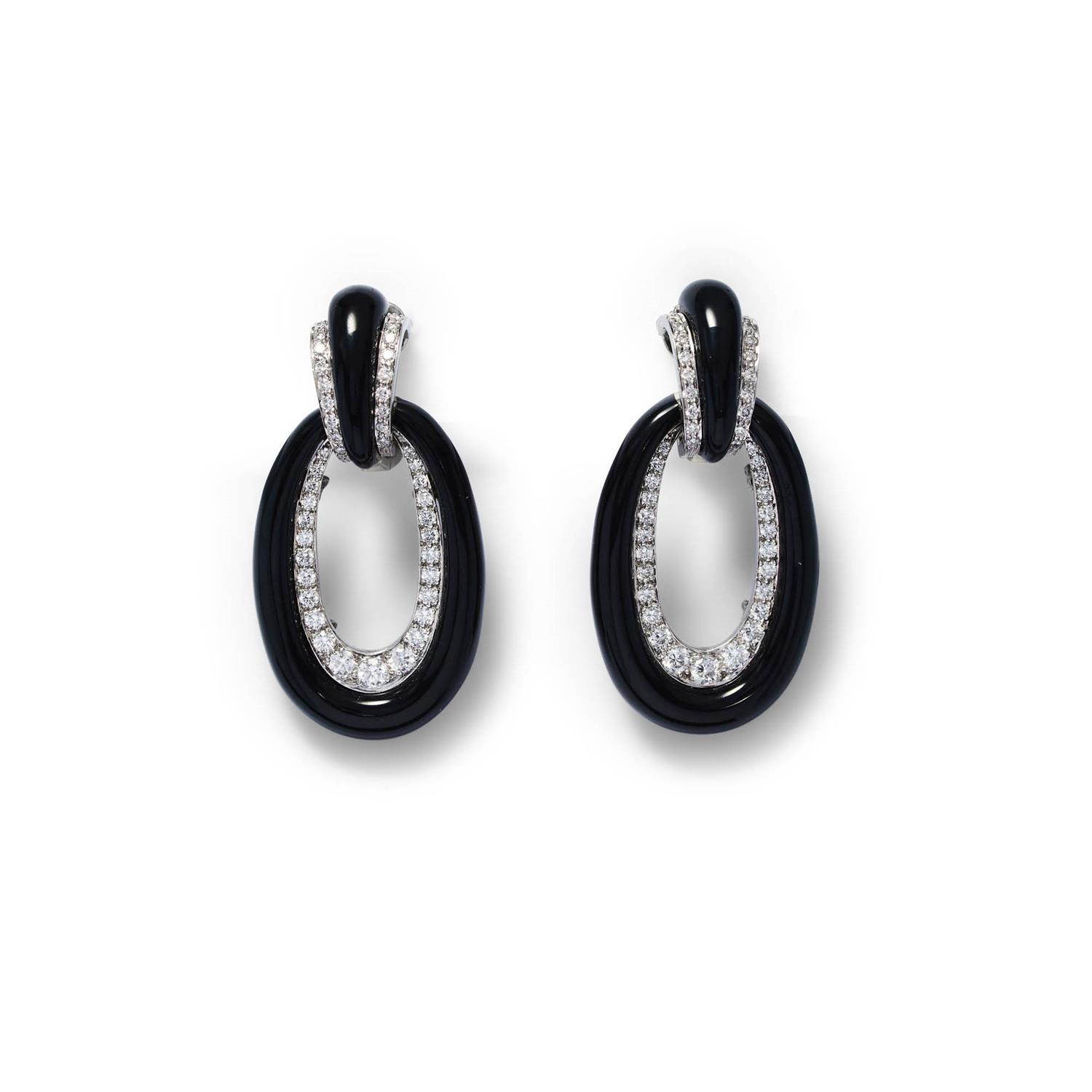 Each terminating on an openwork pear-shaped plaque pavé-set with brilliant-cut diamonds framed by a black onyx surround surmounted by a similarly set half hoop, the diamonds together weighing approximately 2.00 carats, mounted in 18ct gold and platinum, length 41mm, clip fitting, signed Webb for David Webb.