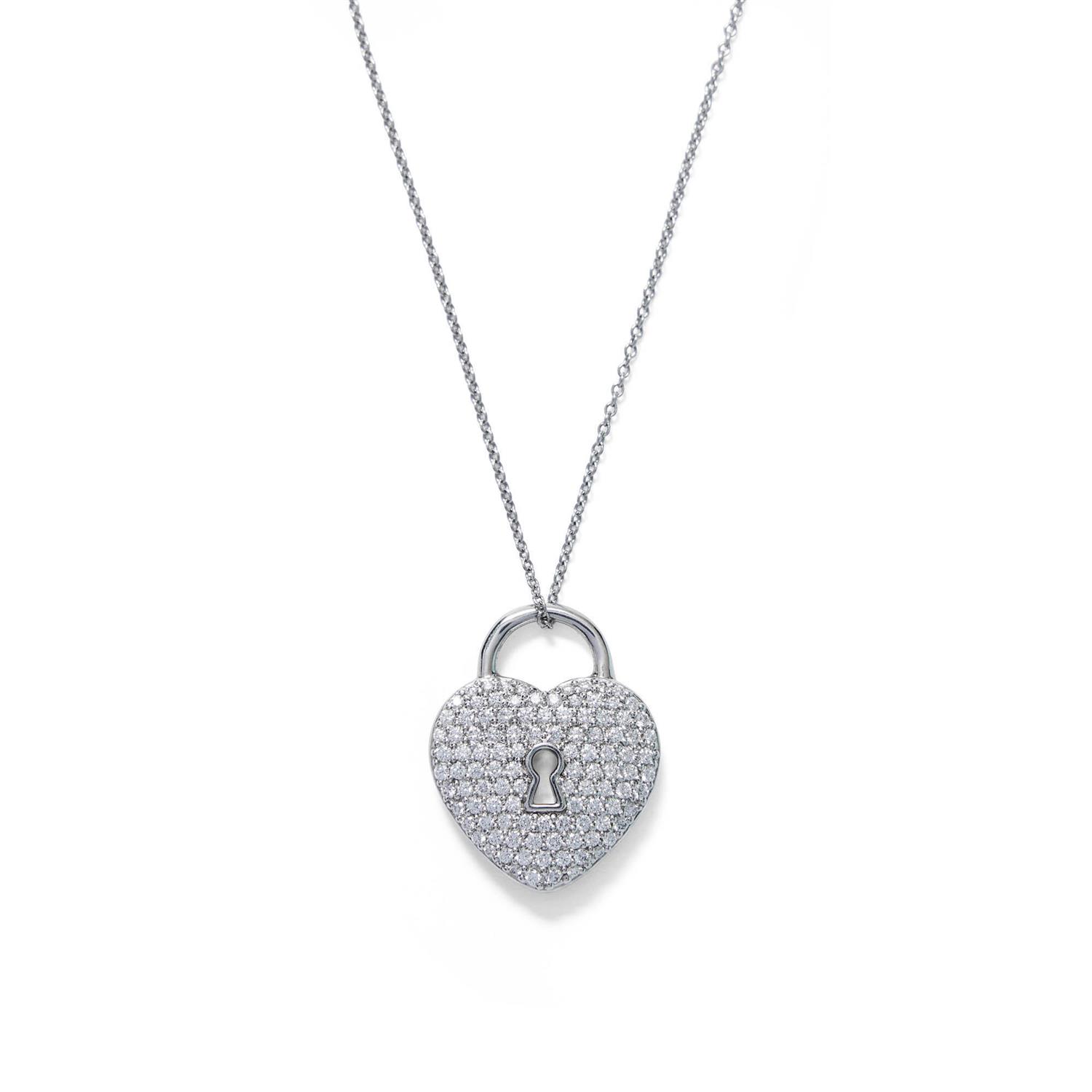 Modelled as a heart-shaped padlock, pavé-set to the front with brilliant-cut diamonds, supported from a trace chain, the diamonds together weighing approximately 0.50 carats, mounted in platinum, pendant length 23mm, inner circumference 450mm, signed Tiffany & Co.