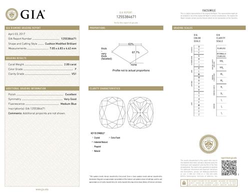 a GIA report numbered 1255384671 dated 3 April 2021 stating that the 2.00 carat diamond is natural, F colour, VS1 clarity, laser inscribed;