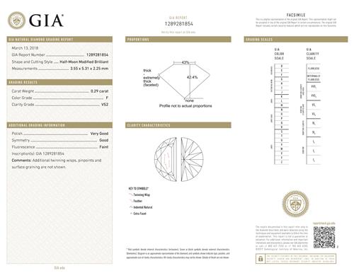a GIA report numbered 1289281854 dated 13 March 2018 stating that the 0.29 carat diamond is natural, F colour, VS2 clarity, laser inscribed;