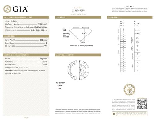 a GIA report numbered 2286285395 dated 13 March 2018 stating that the 0.30 carat diamond is natural, E colour, VS1 clarity, laser inscribed.