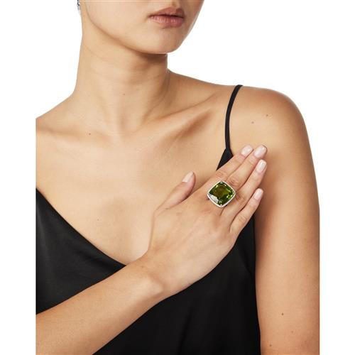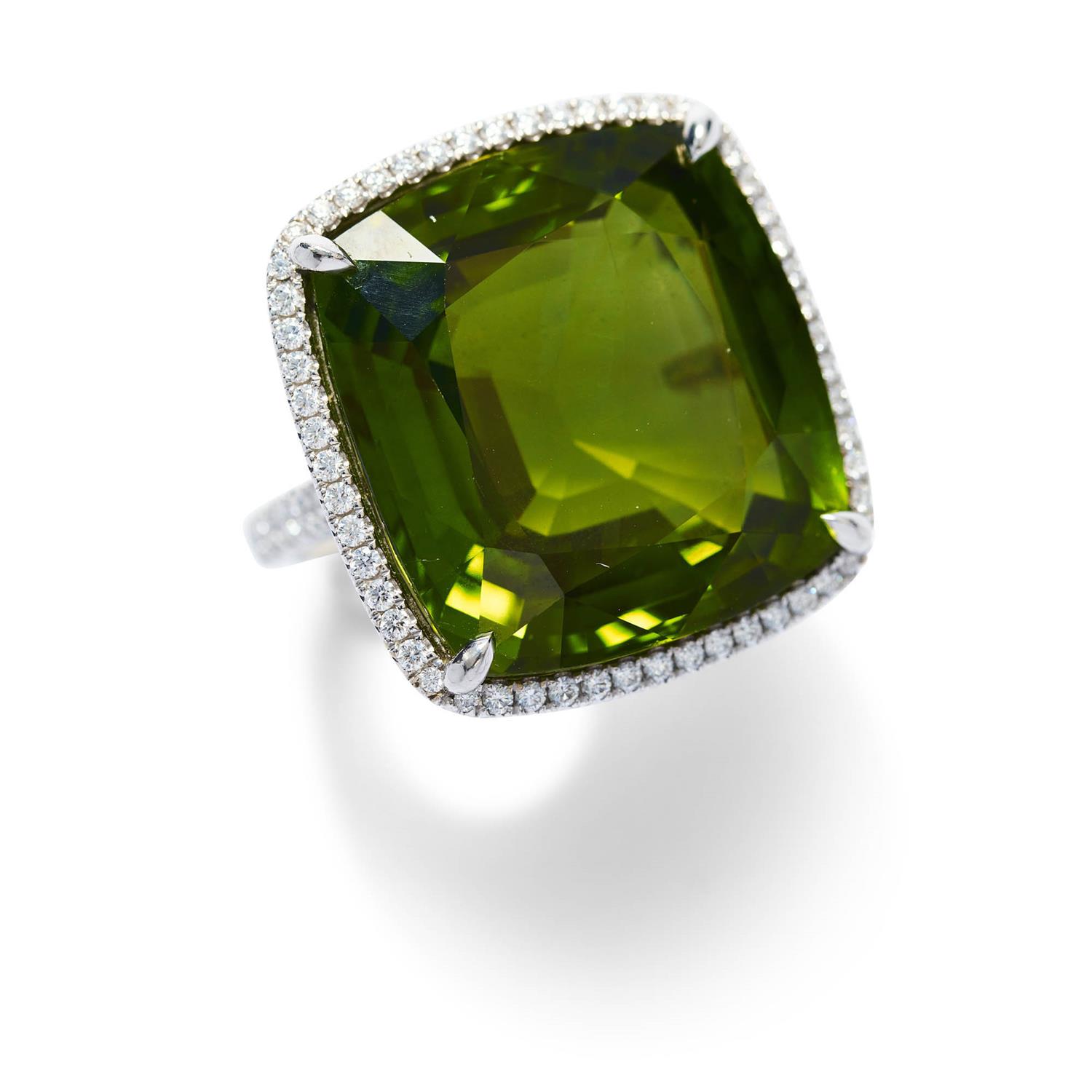 Of cluster design, centring a claw-set cushion-shaped peridot weighing 47.90 carats, framed with a line of near colourless brilliant-cut diamonds, the gallery and reverse decorated in an openwork scroll pattern pavé-set with near colourless and Argyle natural fancy pink diamonds, the near colourless diamonds and pink diamonds weighing approximately 0.13 carats and 0.81 carats respectively, mounted in 18ct white gold, size L.