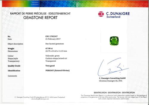 Accompanied by a C. Dunaigre report numbered CDC1702247, dated 21 February 2017, stating that the 47.90 carat peridot is natural, of yellowish-green colour.