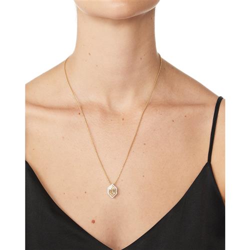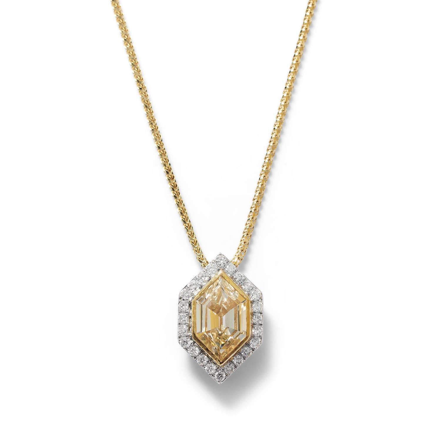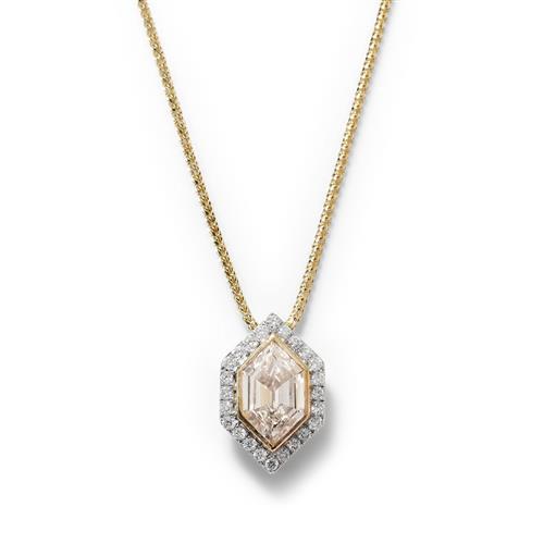 Of cluster design, centring a claw-set lozenge-shaped diamond weighing approximately 2.00 carats, framed by a halo of brilliant-cut diamonds, supported from a fine fancy link chain, the small diamonds together weighing approximately 0.25 carats, mounted in 14ct gold, pendant length 19mm, width 12mm, inner circumference 550mm.