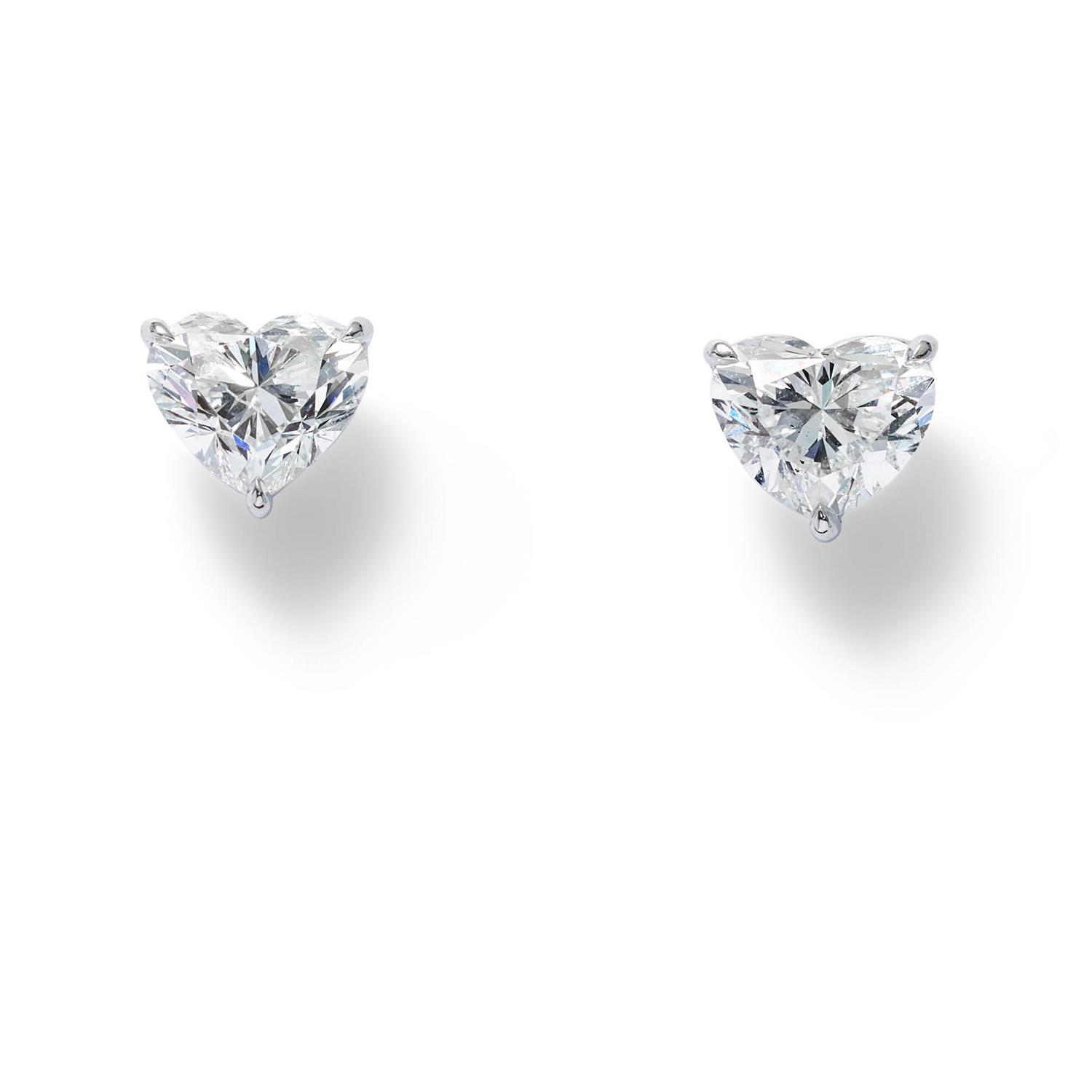 The heart brilliant-cut diamonds weighing 1.01 carats and 1.00 carats respectively, are claw-set, mounted in 18ct white gold, post and scroll fittings.