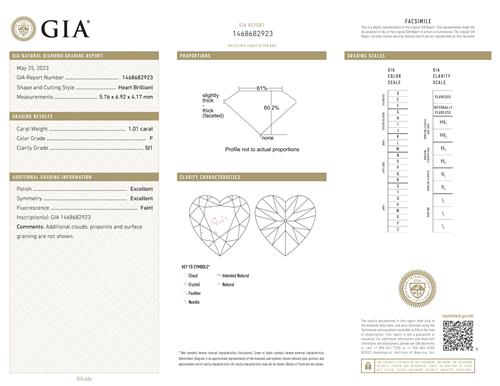 a GIA report numbered 1468682923, dated 25 May 2023, stating that the 1.01 carat diamond is natural, F colour, SI1 clarity, laser inscribed;