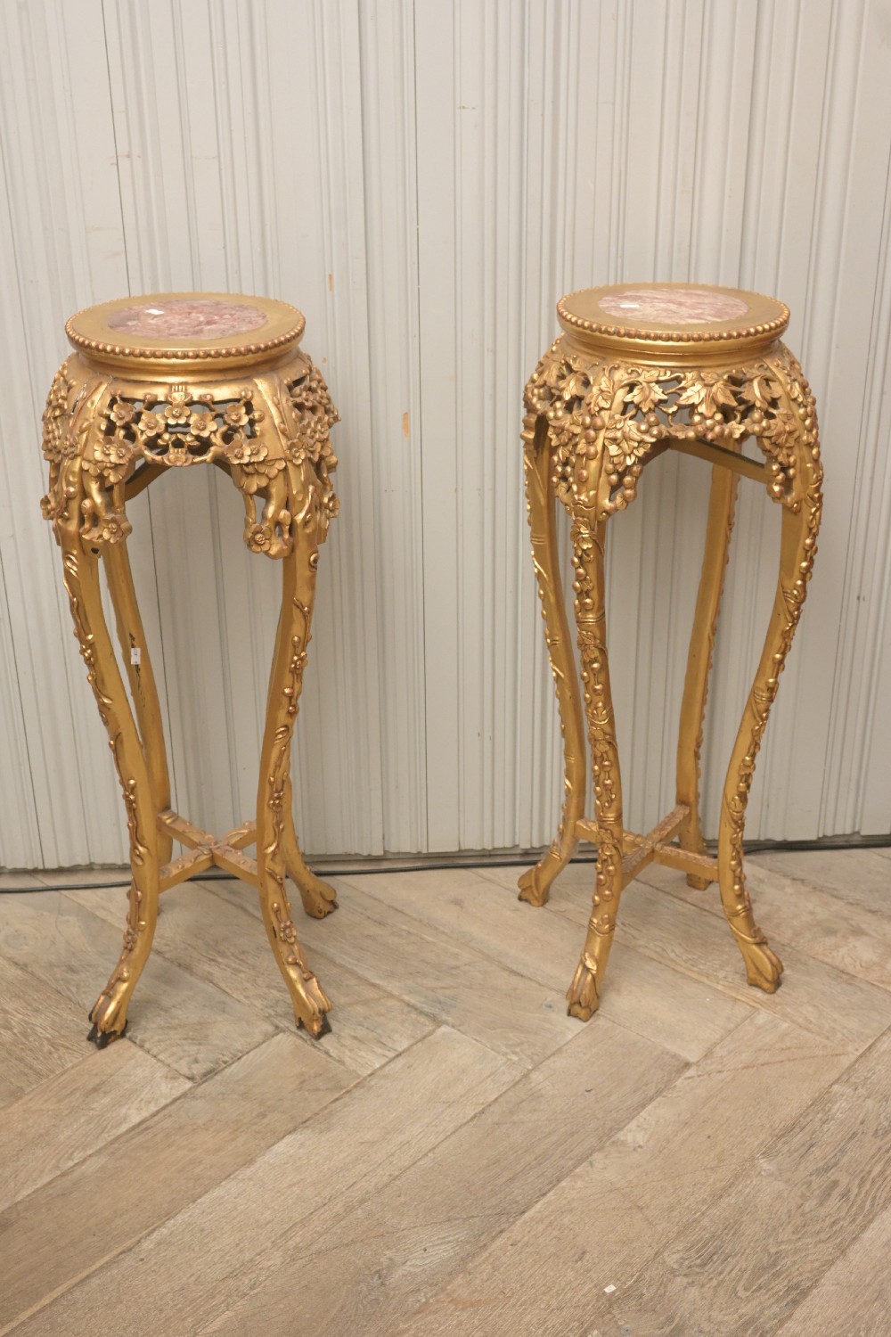 A PAIR OF GILTWOOD MARBLE TOP PEDESTALS (92H X 38DIA CM) (LEONARD JOEL DELIVERY SIZE: X-LARGE)