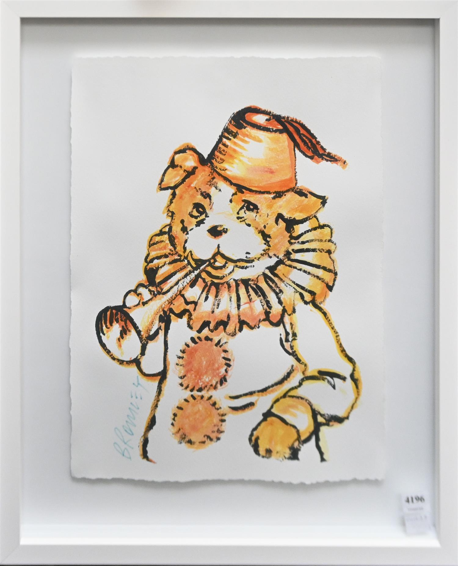 DAVID BROMLEY, CLOWN DOG, MIXED MEDIA ON PAPER, SIGNED LOWER CENTRE, 39.5 X 29.5CM (SHEET), FRAME SIZE: 53 X 43CM