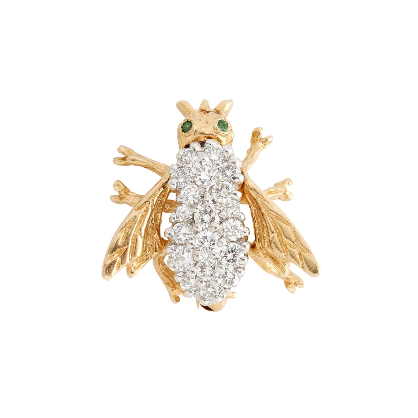 Modelled as a fly, the body claw-set with brilliant-cut diamonds, the eyes detailed with circular-cut emeralds, length 20mm, width 19mm, gross weight 4.80 grams.