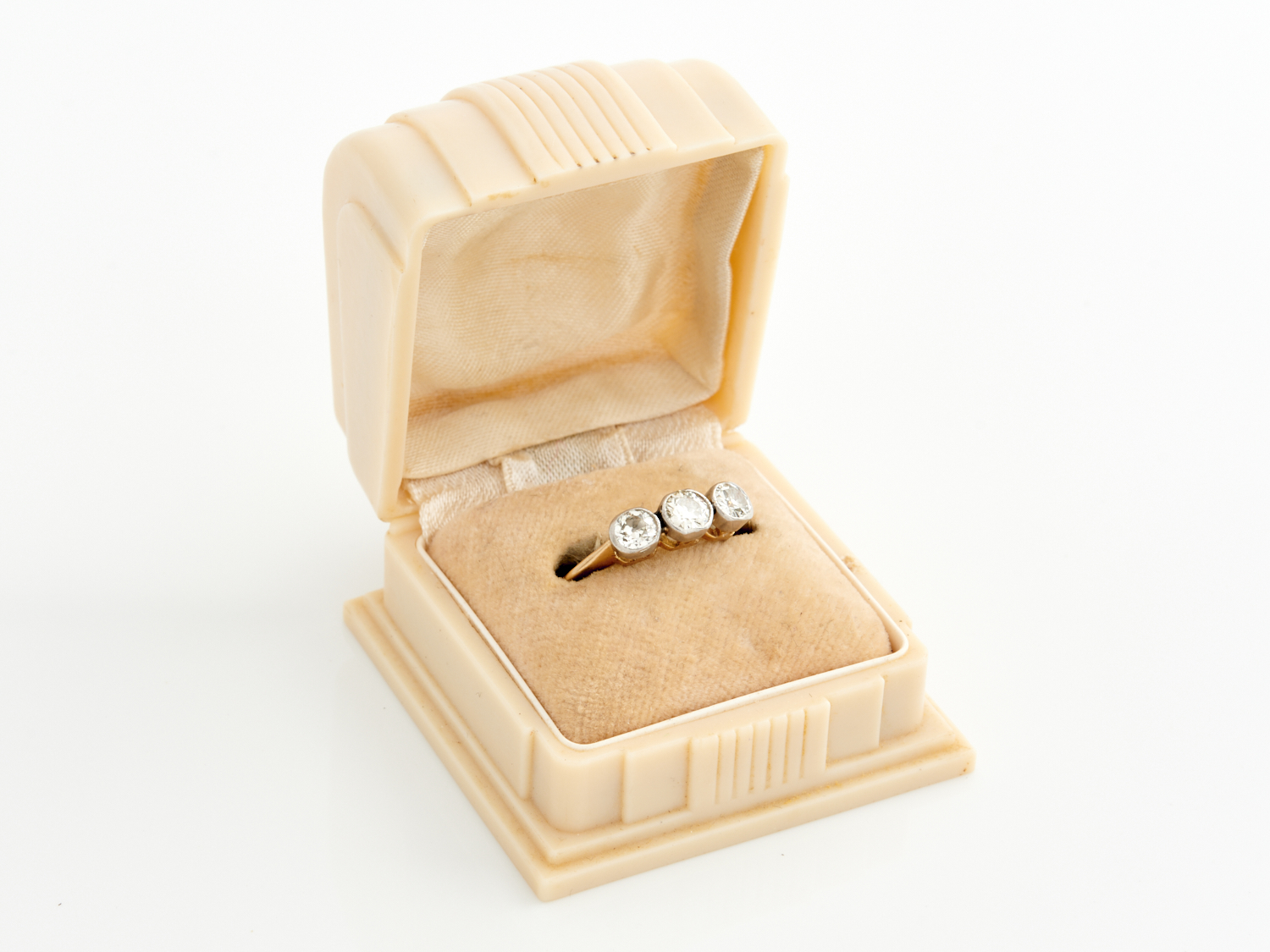 AN ANTIQUE THREE STONE DIAMOND RING IN 18CT GOLD AND PLATINUM, SIZE N, 2.6GMS