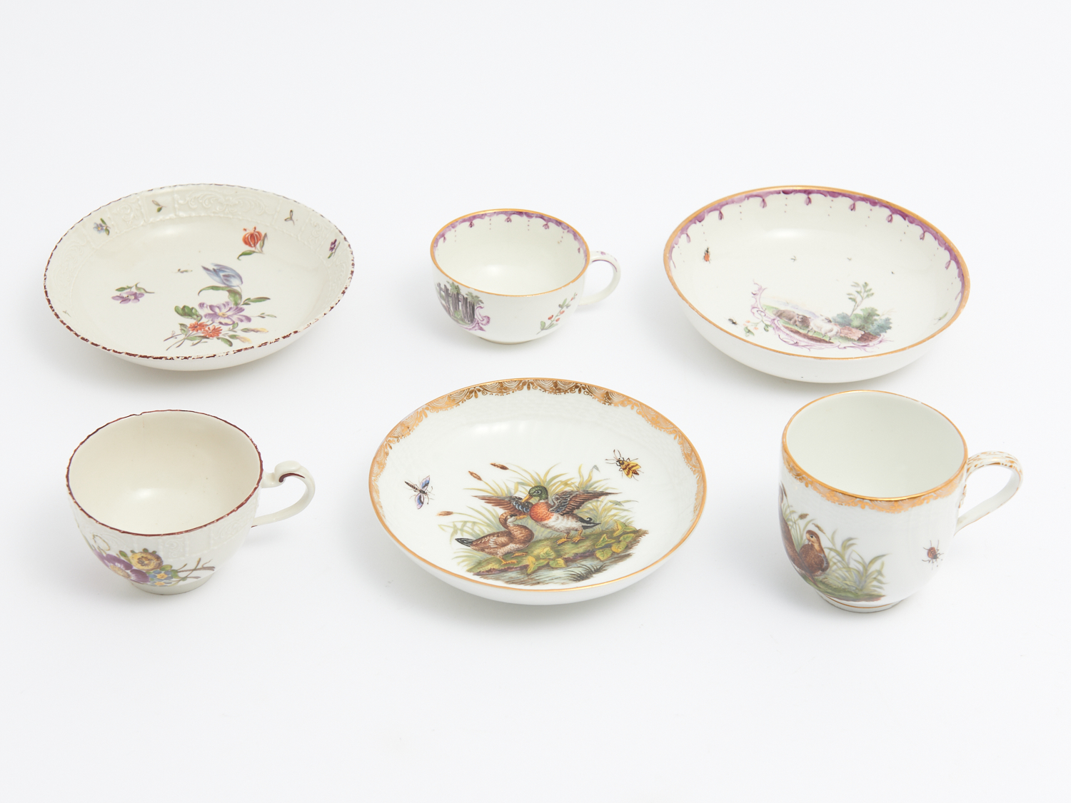 THREE 18TH CENTURY GERMAN PORCELAIN TEACUPS WITH MATCHING SAUCERS INCL LUDWIGSBURG C.1765, HOECHST 1746-1796 AND BERLIN KPM 1765-1770 DIA.13.5CM (LARGEST SAUCER), LEONARD JOEL DELIVERY SIZE: LARGE