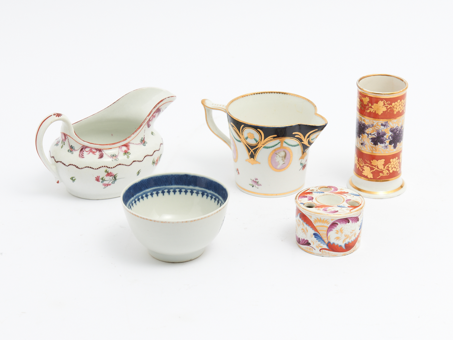 A COLLECTION OF LATE 18TH AND EARLY 19TH CENTURY PORCELAIN ITEMS INCL. A NEW HALL BOAT-SHAPED PORCELAIN JUG 1795-1800, A CHELSEA-DERBY MILK JUG INSPIRED BY THE SEVRES CAMEO SERVICE FOR CATHERINE THE GREAT OF RUSSIA C.1780, A LATE 18TH CENTURY ARMORIAL TEA BOWL, A DERBY CYLINDRICAL SPILL VASE FROM THE EARLY 19TH CENTURY AND A DERBY INKWELL C.1820 H.10CM (TALLEST), LEONARD JOEL DELIVERY SIZE: LARGE
