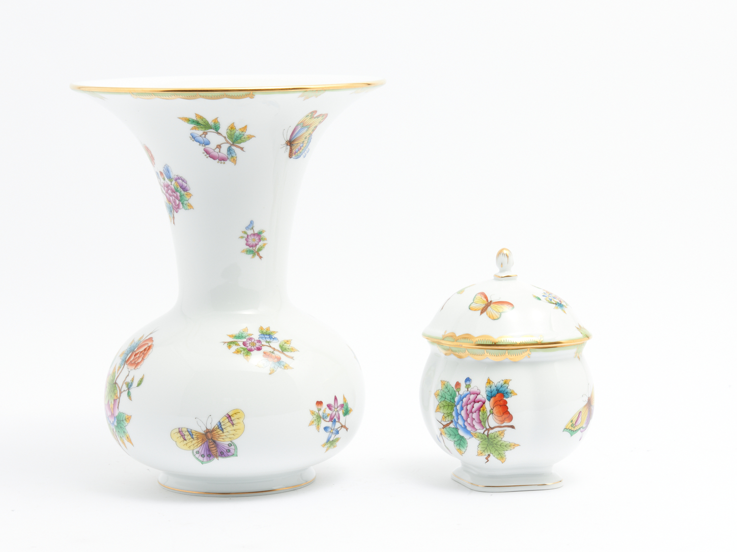 A HEREND PORCELAIN VASE AND LIDDED JAR WITH BUTTERFLY AND BOTANIC DECORATION H.26CM (TALLEST), LEONARD JOEL DELIVERY SIZE: LARGE