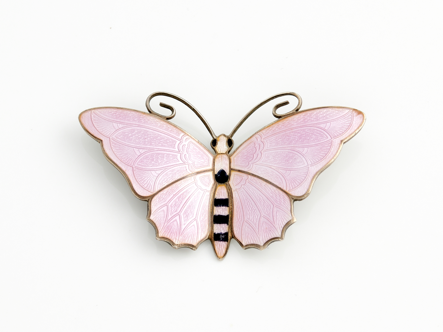 AN ANTIQUE ENAMEL BUTTERFLY BROOCH IN STERLING SILVER, 60MM X 35MM, RETAILED BY HANCOCKS LONDON, ACCOMPANIED BY A HANCOCKS LONDON BOX