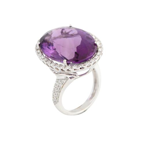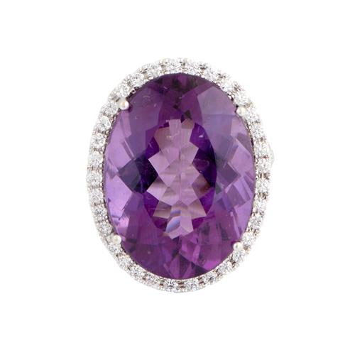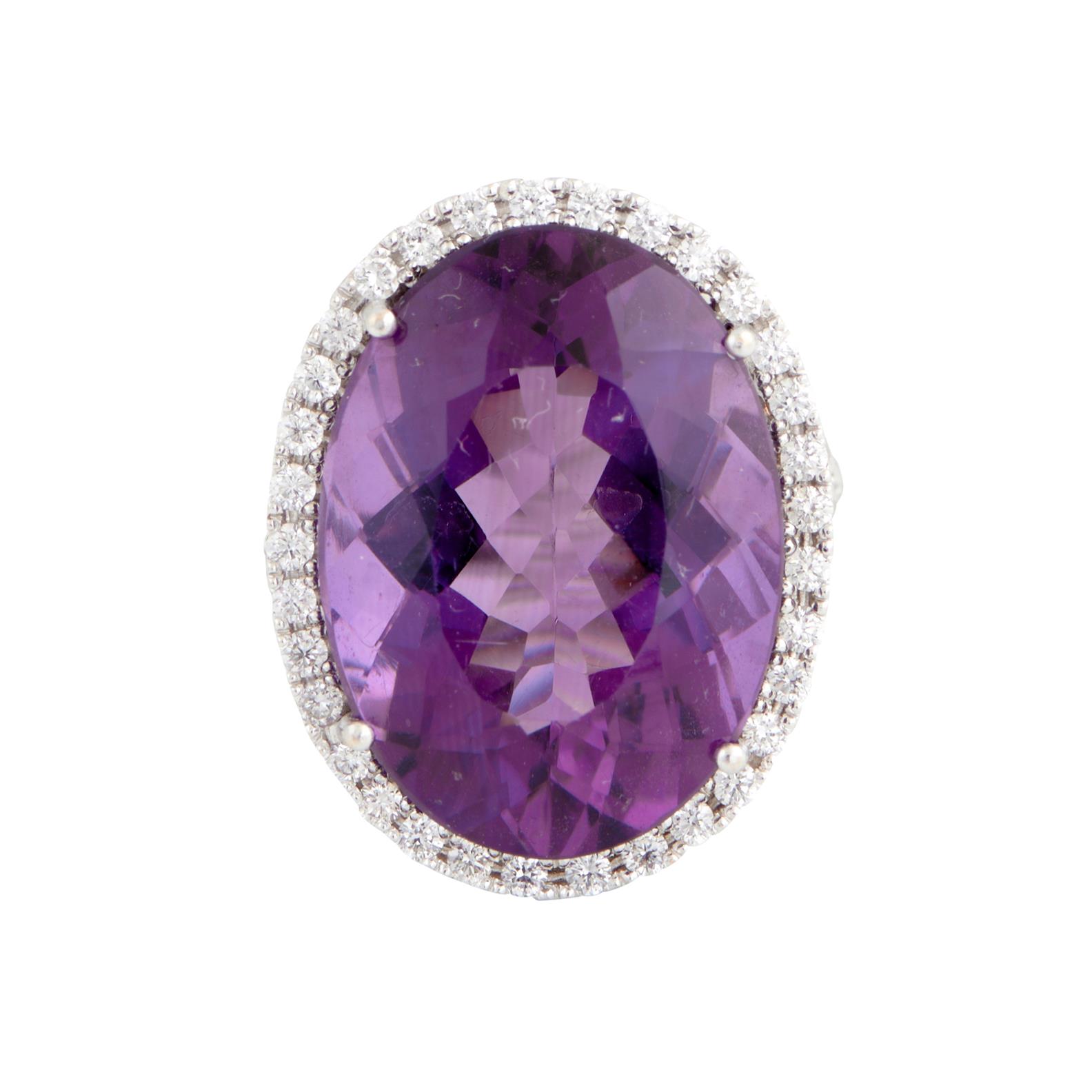 Of cluster design, centring a claw-set oval-cut amethyst weighing approximately 23.00 carats, within a surround brilliant-cut diamonds to diamond set shoulders, the diamonds together weighing approximately 0.86 carats, size L.