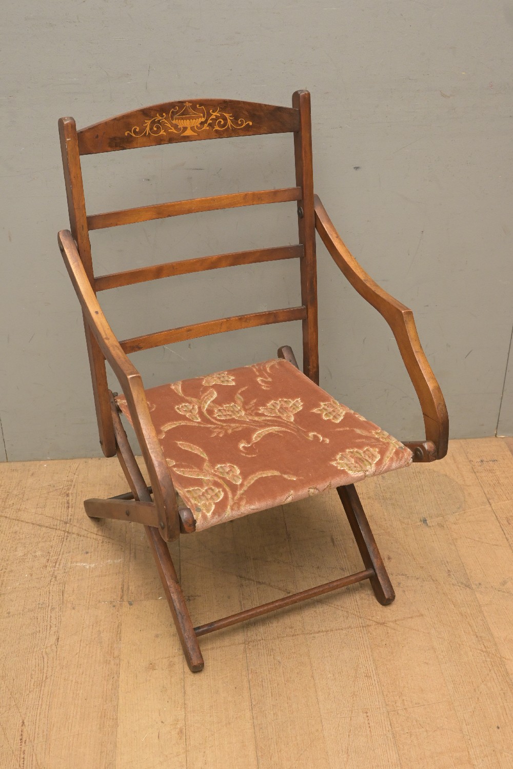 AN ANTIQUE FOLDING CHAIR WITH DECORATIVE INLAY (A/F) (84H X 49W X 51D CM) (LEONARD JOEL DELIVERY SIZE: LARGE)