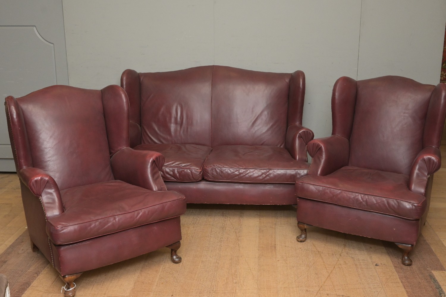 A GEORGIAN THREE PIECE LOUNGE SUITE CONSISTING OF A TWO SEATER SOFA AND TWO MATCHING WINGBACK ARMCHAIRS UPHOLSTERED IN BURGUNDY LEATHER (100H X 146W X 92D CM) (PLEASE NOTE THIS HEAVY ITEM MUST BE REMOVED BY CARRIERS AT THE CUSTOMER'S EXPENSE. LEONARD JOEL STAFF CANNOT ASSIST CARRYING THIS ITEM) (X-LARGE ITEM)