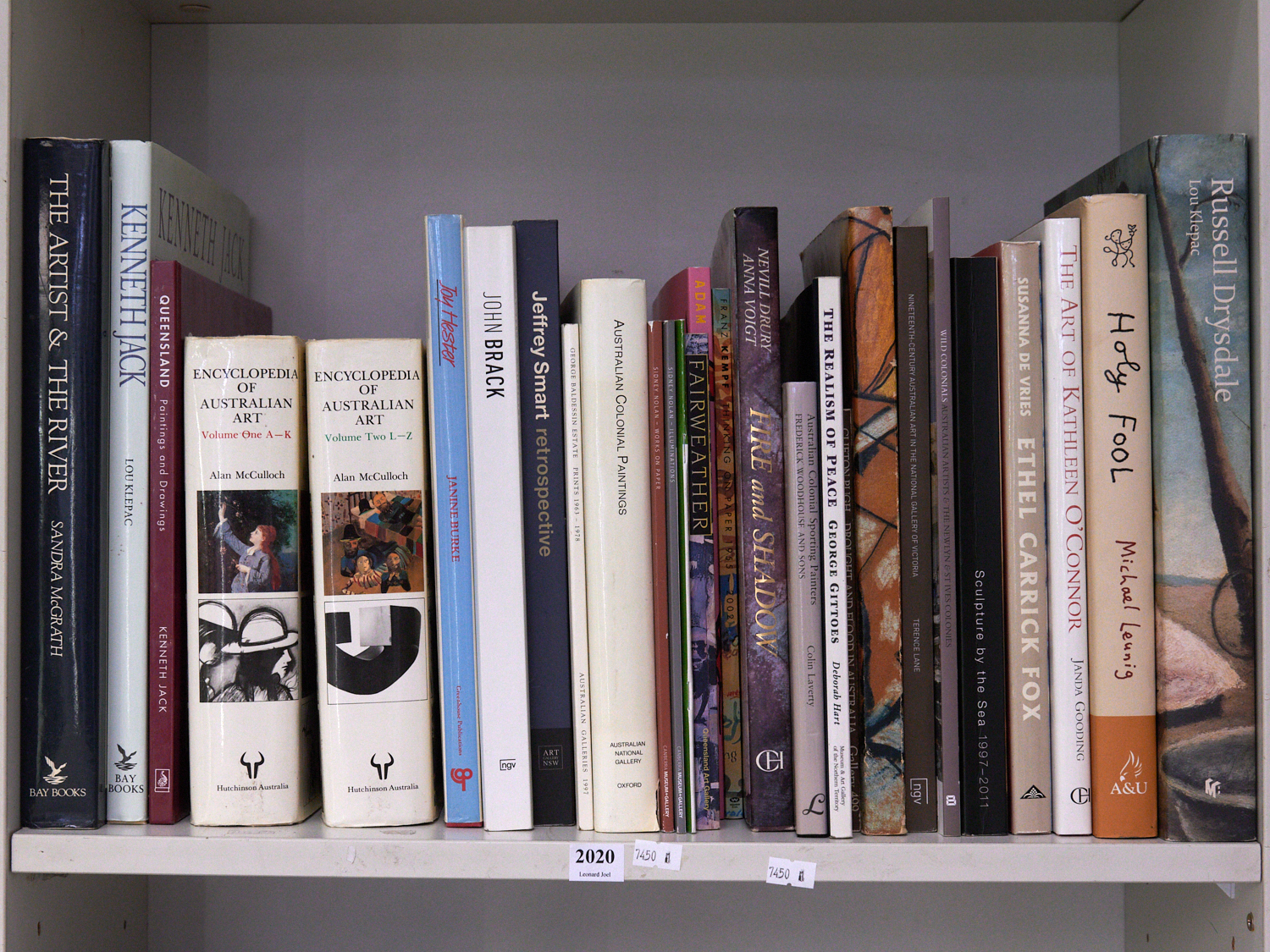A SHELF OF AUSTRALIAN ART REFERENCE INCLUDING ETHEL CARRICK FOX, RUSSELL DRYSDALE, JEFFREY SMART, AND KENNETH JACK (SIGNED), LEONARD JOEL DELIVERY SIZE: LARGE