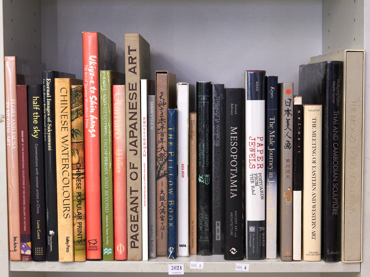 A SHELF OF ASIAN ART REFERENCE INCLUDING THE BRONZE DOUQ SON DRUMS (SLIP CASED), CHINESE POPULAR PRINT, AND THAI AND CAMBODIAN SCULPTURE