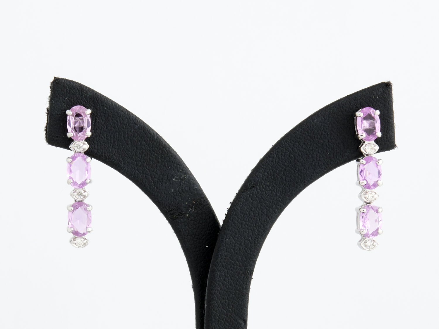 A PAIR OF PINK SAPPHIRE AND DIAMOND EARRINGS IN 18CT WHITE GOLD TO POST AND BUTTERFLY FITTINGS, THE SAPPHIRES TOTALLING 3.00CTS, WITH DIAMONDS TOTALLING 0.08CTS, APPROXIMATELY 25MM