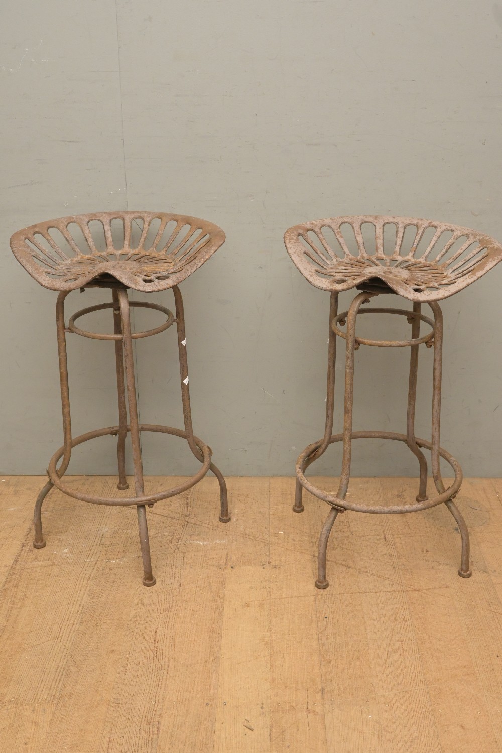 A PAIR OF INDUSTRIAL STYLE CAST METAL BARSTOOLS WITH TRACTOR SEATS (A/F) (80H X 54DIAM CM)(LEONARD JOEL DELIVERY SIZE: LARGE)