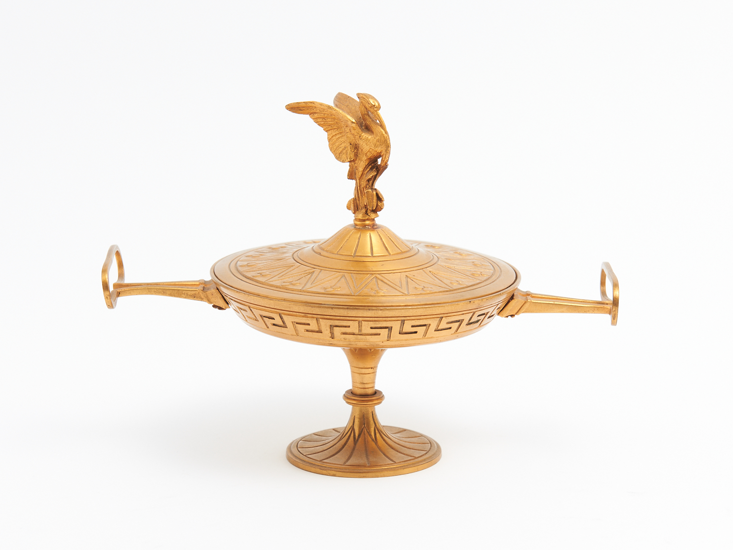 A LIDDED COMPORT IN GOLD-COLOURED METAL H.16CM, LEONARD JOEL DELIVERY SIZE: SMALL