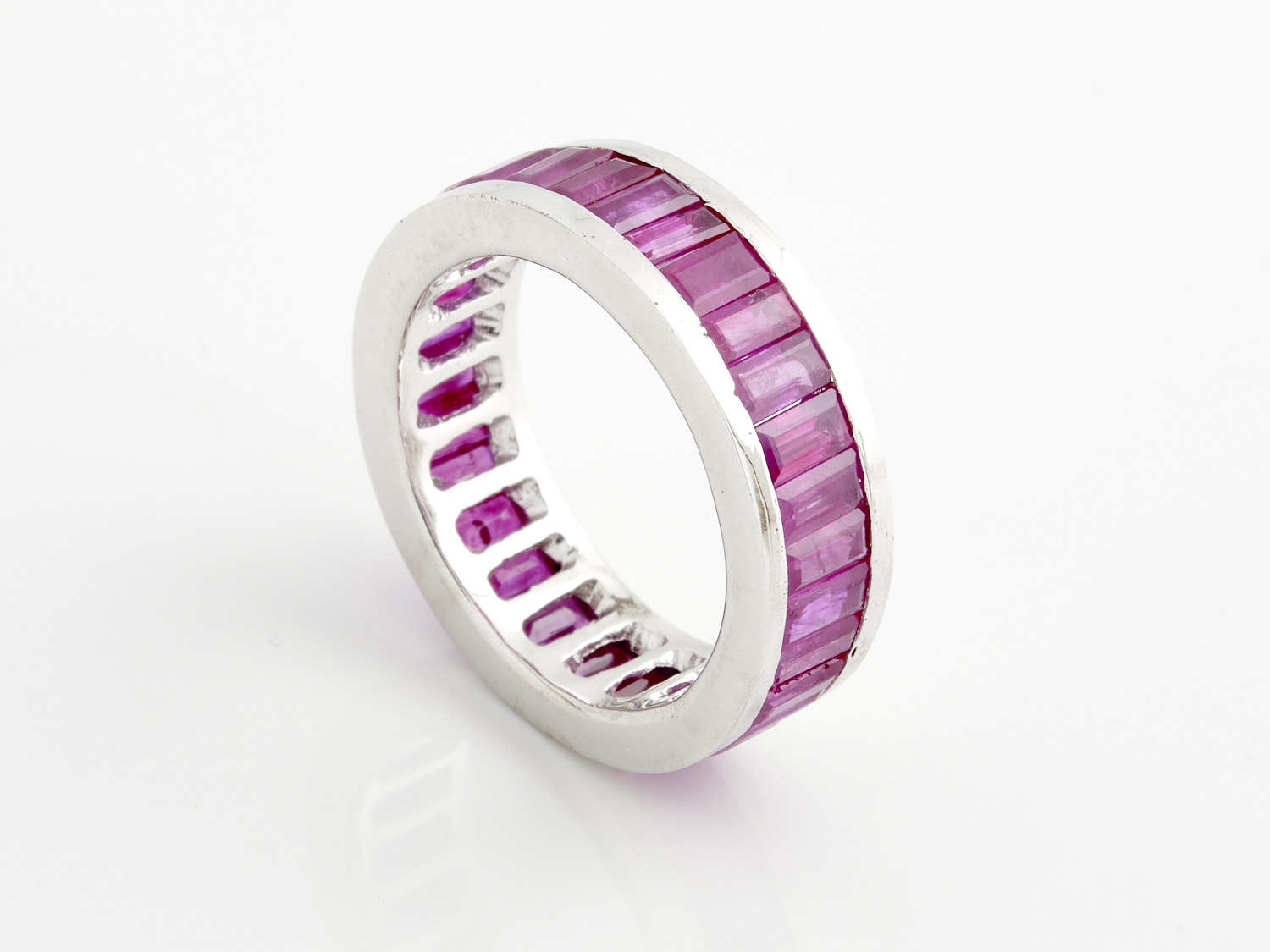 A RUBY ETERNITY BAND IN 18CT WHITE GOLD, THE RUBIES TOTALLING 8.10CTS, SIZE P