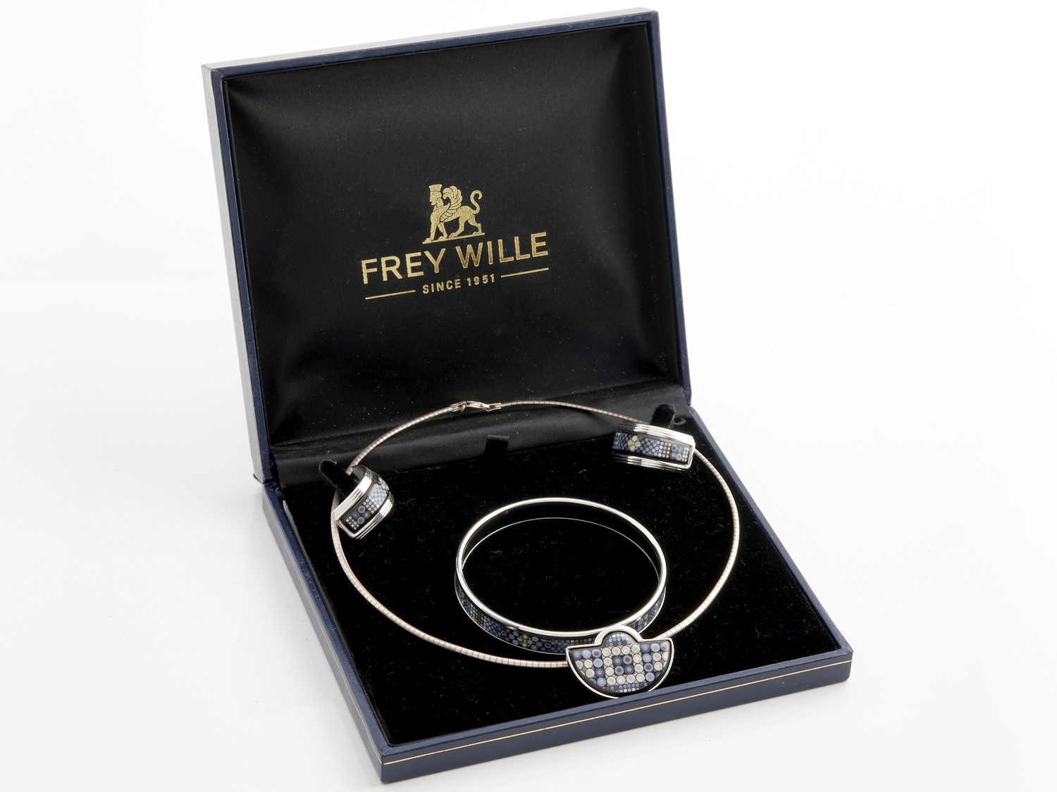 FREY WILLE, AN ENAMELLED JEWELLERY SUITE, COMPRISING A BANGLE, EARRINGS AND PENDANT NECKLACE, BOXED