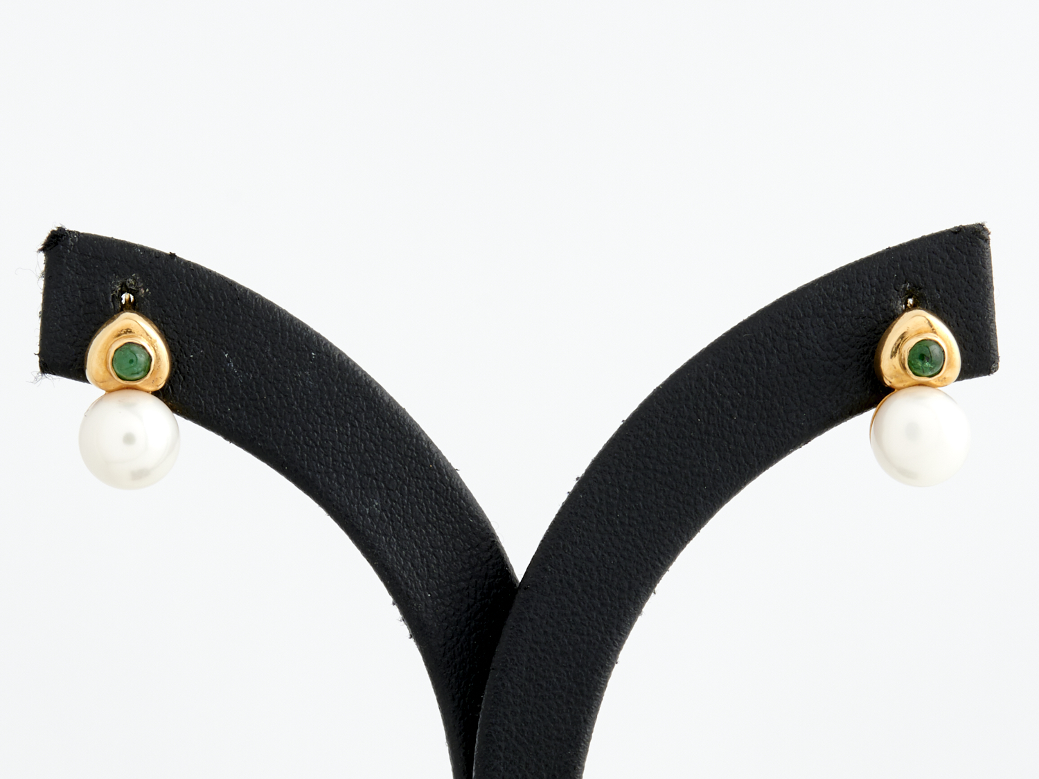 A PAIR OF PEARL AND EMERALD EARRINGS IN 18CT GOLD, TO POST AND HINGE FITTINGS