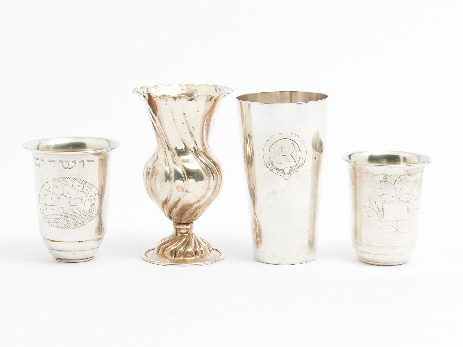 FOUR PIECES OF SILVER INCLUDING JUDAICA SILVER AND AN 800 SILVER CUP 244G H.11.5CM (TALLEST), LEONARD JOEL DELIVERY SIZE: SMALL