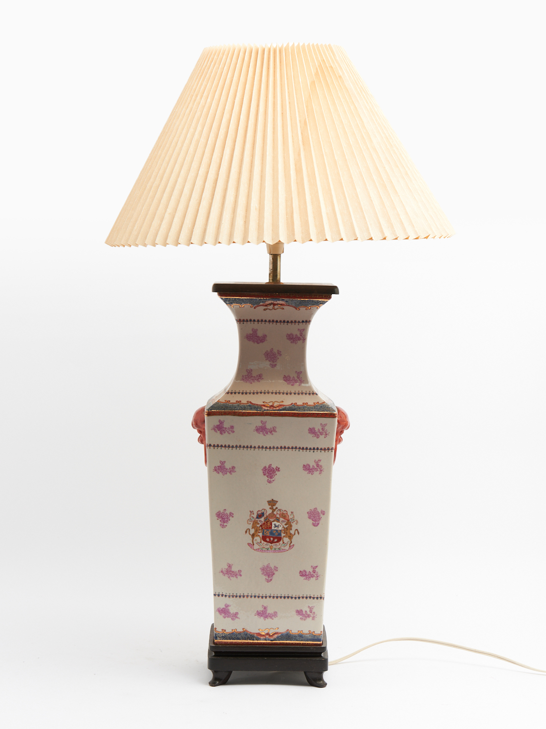 A CHINESE EXPORT WARE FAMILLE ROSE LAMP BASE WITH ARMORIAL DETAILING H.82CM (A/F TO SOCKET AND SWITCH), LEONARD JOEL DELIVERY SIZE: LARGE