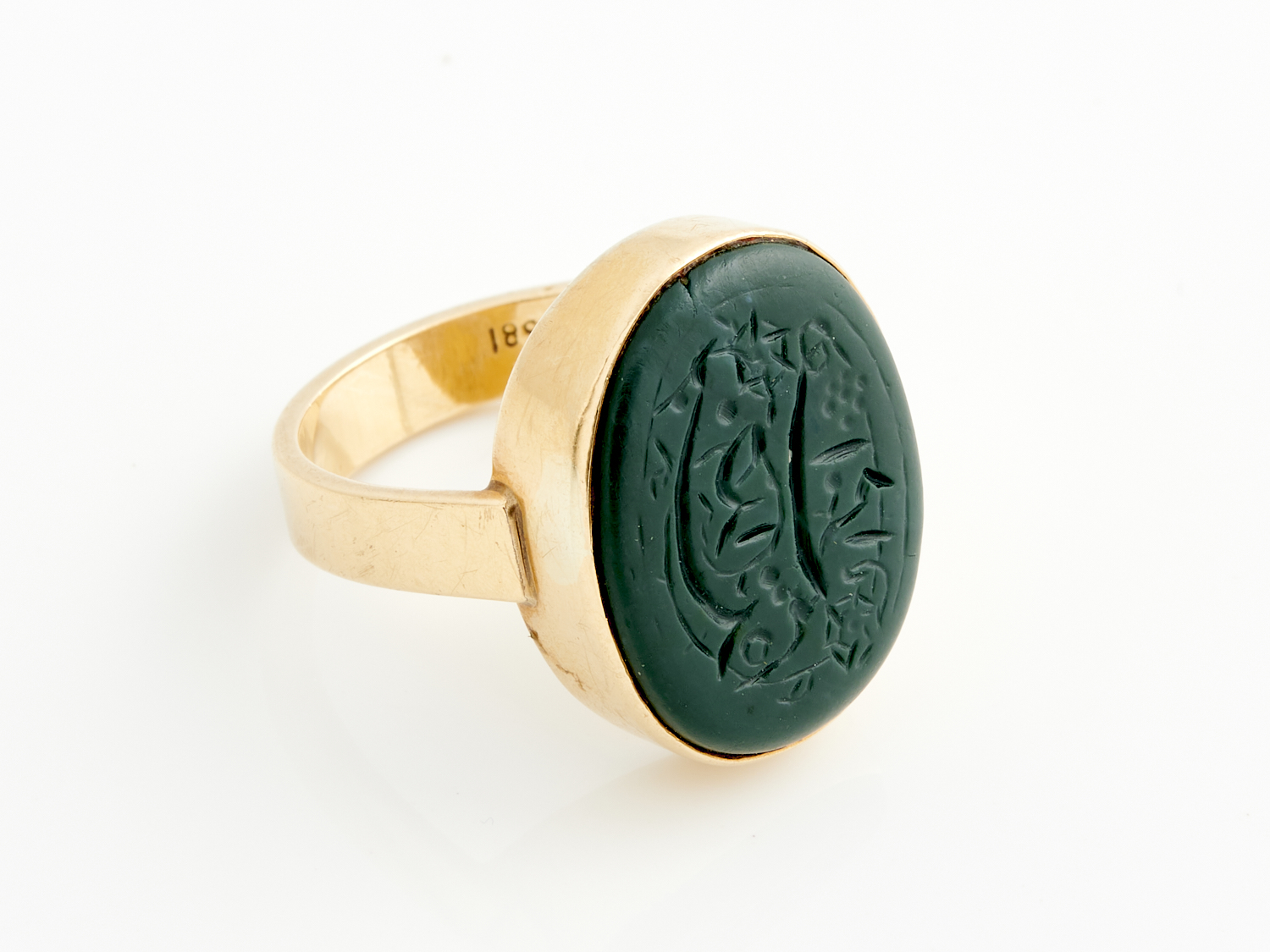 A CARVED HARD STONE RING IN 18CT GOLD, SIZE O, 8.9GMS