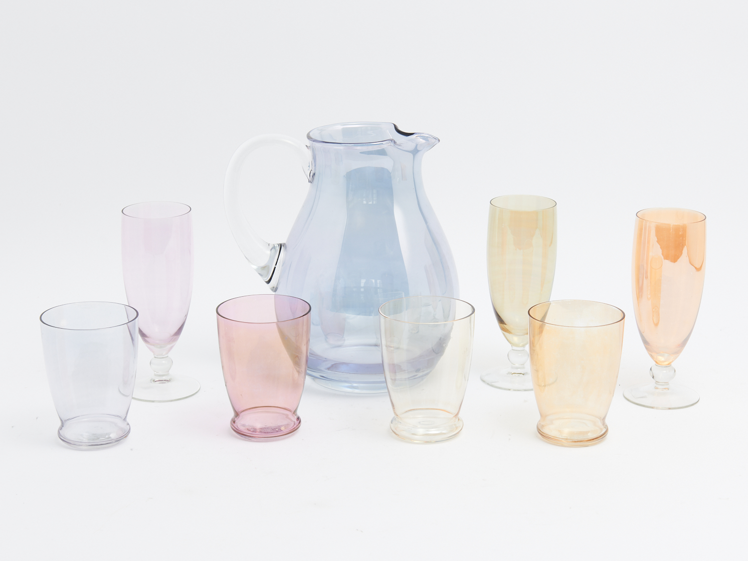 A HARLEQUIN SET OF LUSTRE GLASS INCLUDING A JUG, FOUR GLASSES AND THREE TALLER GLASSES H.23CM (TALLEST), LEONARD JOEL DELIVERY SIZE: MEDIUM