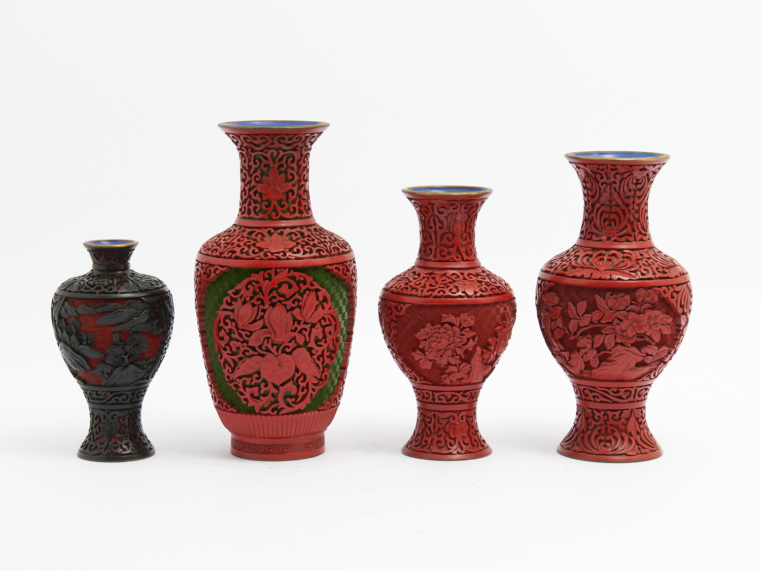 FOUR CHINESE CARVED CINNABAR STYLE VASES H.25.5CM (TALLEST), LEONARD JOEL DELIVERY SIZE: MEDIUM