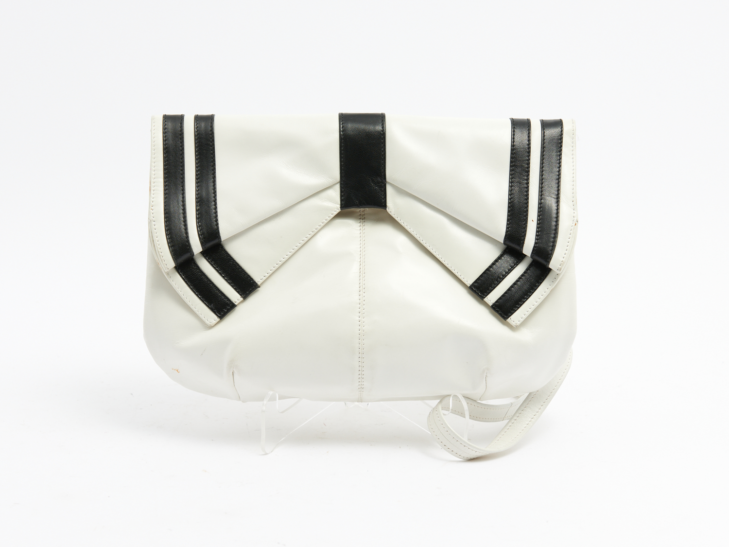 A VINTAGE ITALIAN RODO WHITE AND BLACK LEATHER SHOULDER BAG WITH BOW DETAILING AND TAUPE LEATHER INTERIOR W.27.5CM, LEONARD JOEL DELIVERY SIZE: SMALL