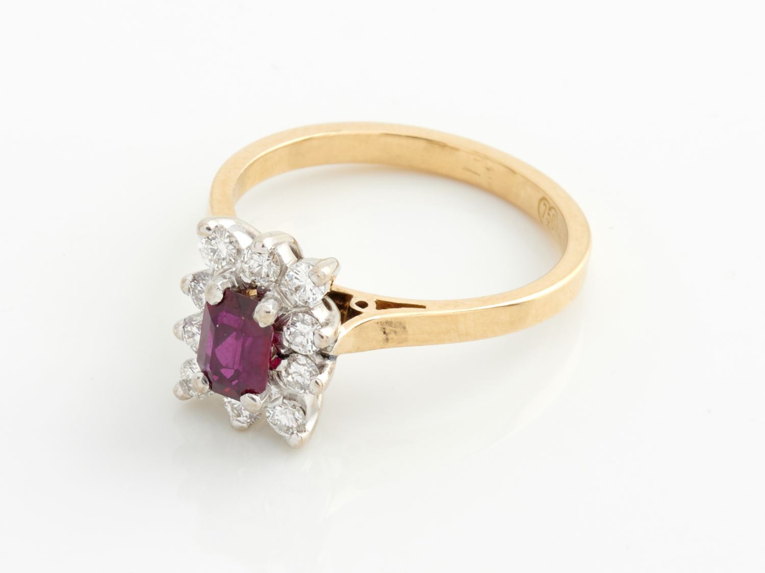 A RUBY AND DIAMOND CLUSTER RING IN 18CT AND 9CT GOLD, SIZE M, 3.6GMS, ACCOMPANIED BY A VALUATION